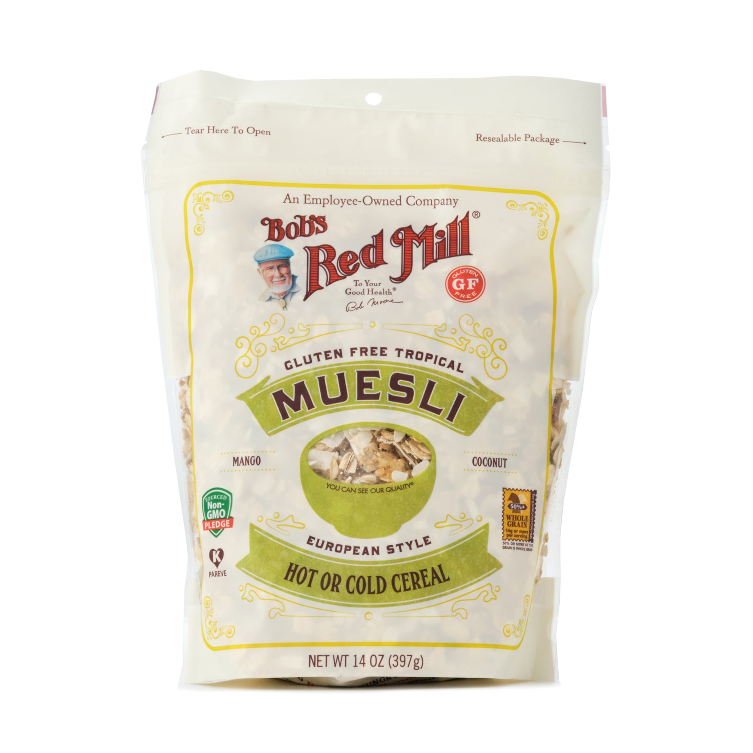 This Gluten Free Tropical Muesli features three favorite Bob’s Red Mill gluten free grains while real mango and strawberry pieces pop with fruity bursts. Pumpkin and sunflower seeds partner with almonds and macadamias for a nutty undertone. Enjoy it hot or cold; served with milk, yogurt, or even juice; or eaten straight out of the bag!