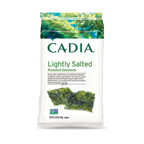 Cadia Lightly Salted Roasted Seaweed is crispy with a light flavor. It is great in soups and salads or as a savory snack. Gathered from the Pacific Ocean waters off of South Korea, it is roasted with rice bran oil and a touch of sea salt.
