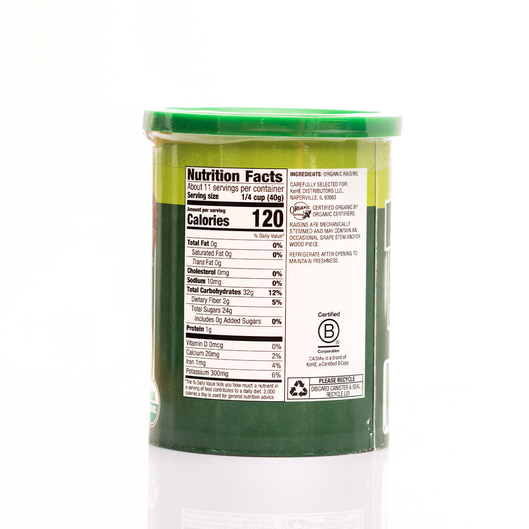 Cadia Organic Sun Dried Raisins are naturally sweet, with no added sugar, fat-free, and cholesterol-free. Grown organically and sun-dried to perfection, these raisins are moisty and chewy with a rich amber color. Enjoy them by the handful or add them in a variety of recipes, from salads to baked goods.