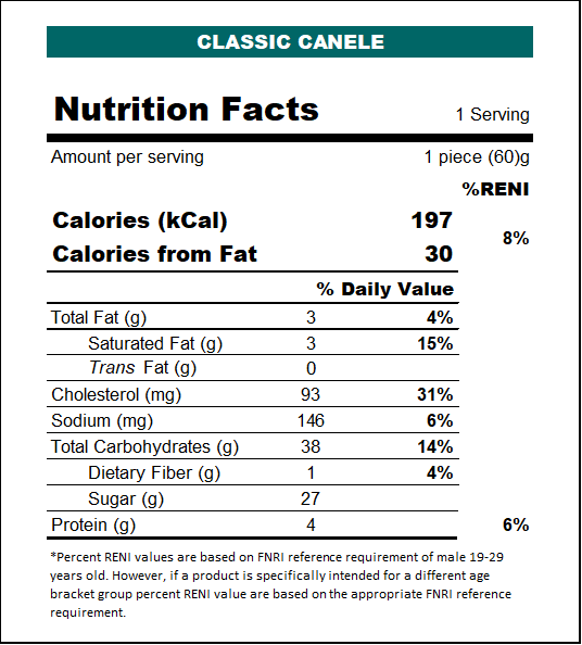 Reheating instructions: Canelés are believed to be best 1 to 5 hours after baking. To refresh, heat canelé in 260℃ degree oven for five minutes.