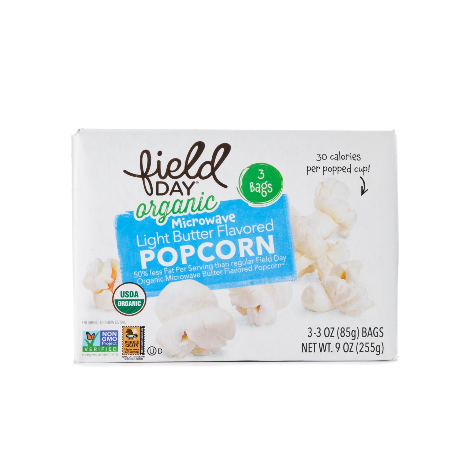 Field Day Organic Light Butter Popcorn brings family movie night to your own home! Made from organic whole grain yellow popcorn with a hint of organic butter goodness. It is a good source of fiber, with no preservatives, artificial colors or flavors.