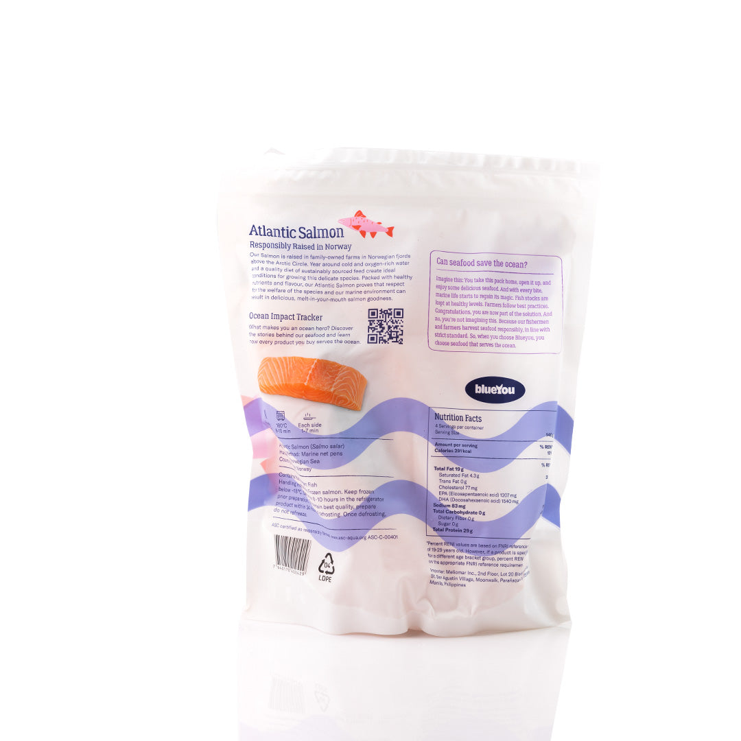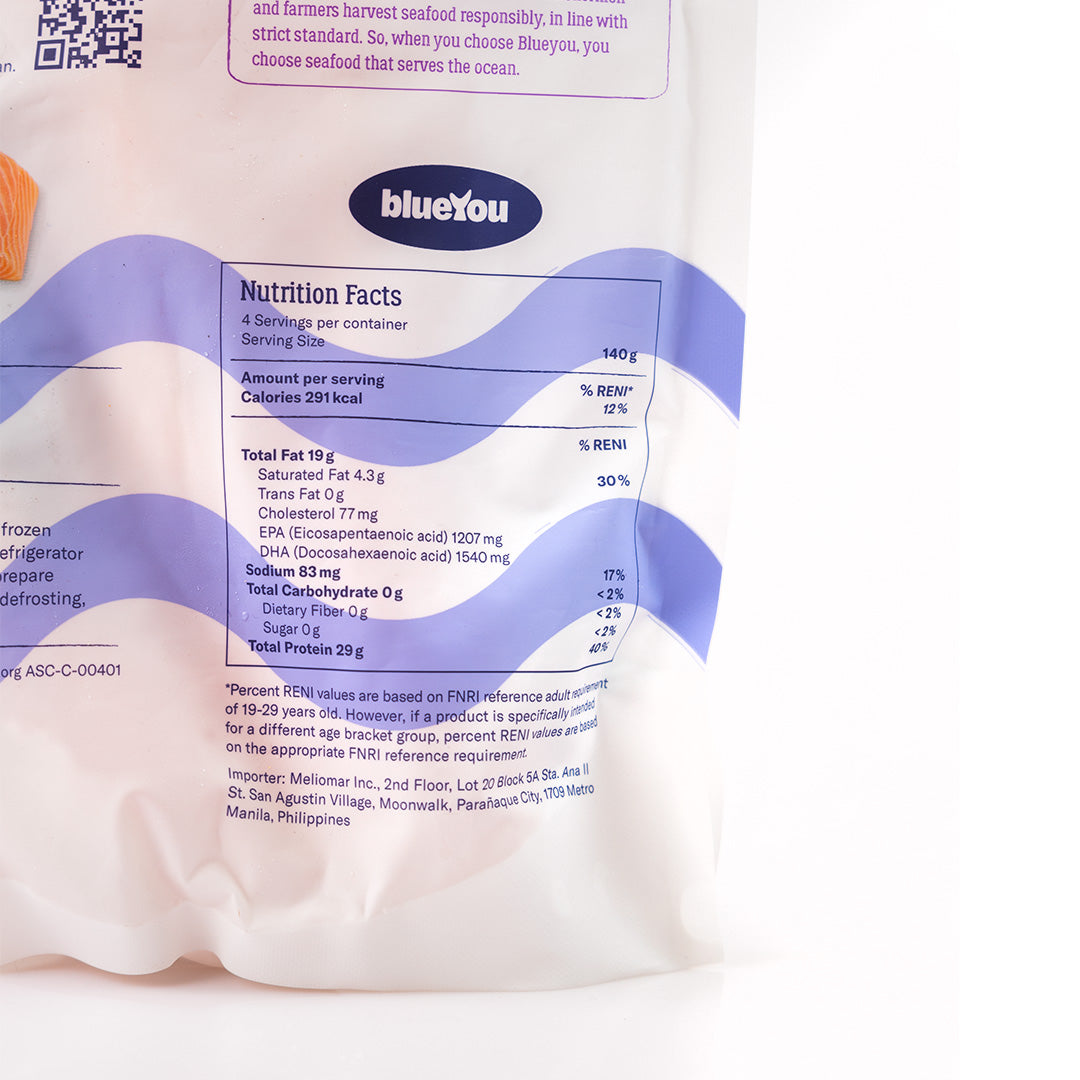 To preserve its freshness, Blueyou Atlantic Salmon is quick frozen at temperatures of -40°C and sealed in tight vacuum packs immediately after being harvested and processed, preventing oxidation and rancidity during storage. The result is a high quality product that maintains the essential fatty acids and fresh taste of salmon.