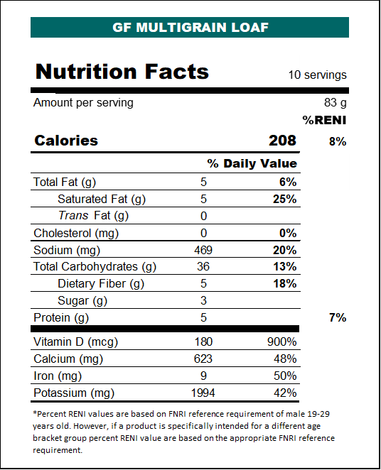 Starch mix (white rice flour, cornstarch, brown rice flour, tapioca starch, potato starch, xanthan gum), milk, eggs, sugar, Kefir (milk, Kefir), seed mix (rolled oats, hulled millet, flaxseed, pumpkin seeds, white sesame seeds, black sesame seeds), olive oil, water, salt, and yeast.