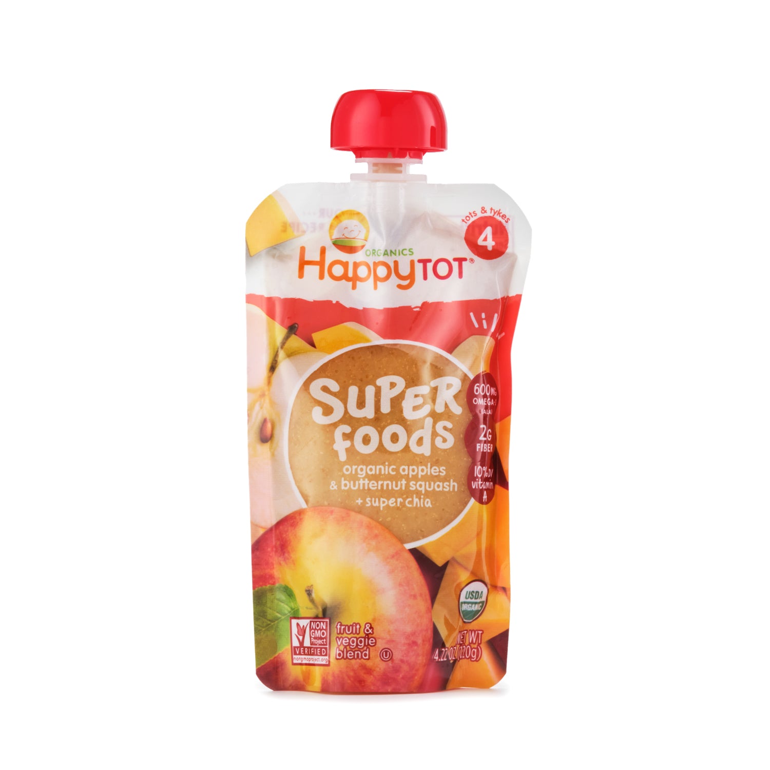 Organic apples and butternut squash get a boost from chia, which adds fiber and Omega-3s (ALA); toddlers love the yummy flavor they can feed themselves, parents love the nutritious superfoods.