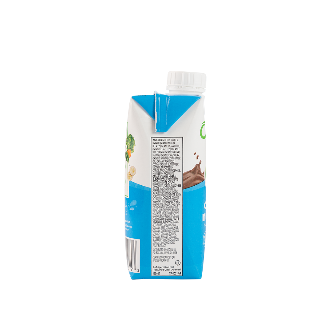 Filtered Water, Orgain Organic Protein (Orcanic Pea Protein. Organic Chia Seeds), Organic Rice Dextrin, Organic Cane Sugar, Organic Natural Flavors, Organic High Oleic Sunflower Oil, Organic Alkalized Cocoa, Organic Sunflower Lecithin, Tripotassium Citrate, Tricalcium Phosphate, Magnesium Phosphate, Orgain Vitamin & Mineral Blend"' (Sodium Ascorbate. Zinc Gluconate, D-Alpha Tocopheryl Acetate, Manganese Sulfate, Niacinamide, Beta Carotene, Potassium Iodide, Calcium-D-Pantothenate. Biotin, Chromium Chloride, Copper Gluconate, Ergocalciferol, Sodium Molybdate, Folic Acid, Pyridoxine Hydrochloride, Riboflavin, Thiamin Hydrochloride, Sodium Selenate, Methylcobalamin), Sodium Bicarbonate, Natural Flavor, Gellan Gum, Orgain Organic Fruit & Vegetable Blend"' (Organic Apple Fiber, Organic Acai, Organic Beet, Organic Kale, Organic Raspberry, Organic Spinach, Organic Tomato, Organic Banana, Organic Blueberry, Organic Carrot), Sea Salt