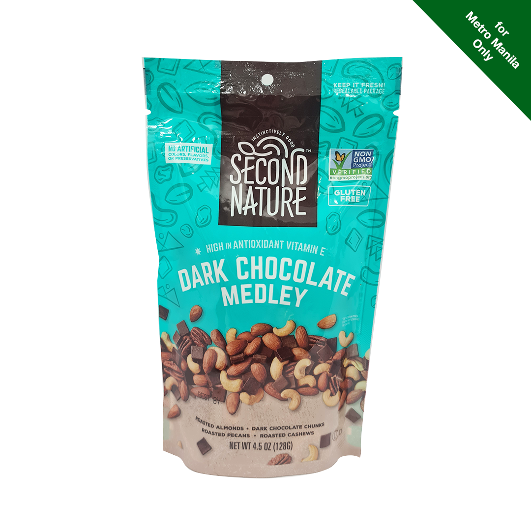 Second Nature Dark Chocolate Medley Trail Mix is a nut lover's blend of dark chocolate chunks, almonds, cashews, and pecans. This is the perfect mix of nuts and rich dark chocolate chunks to satisfy your cravings.