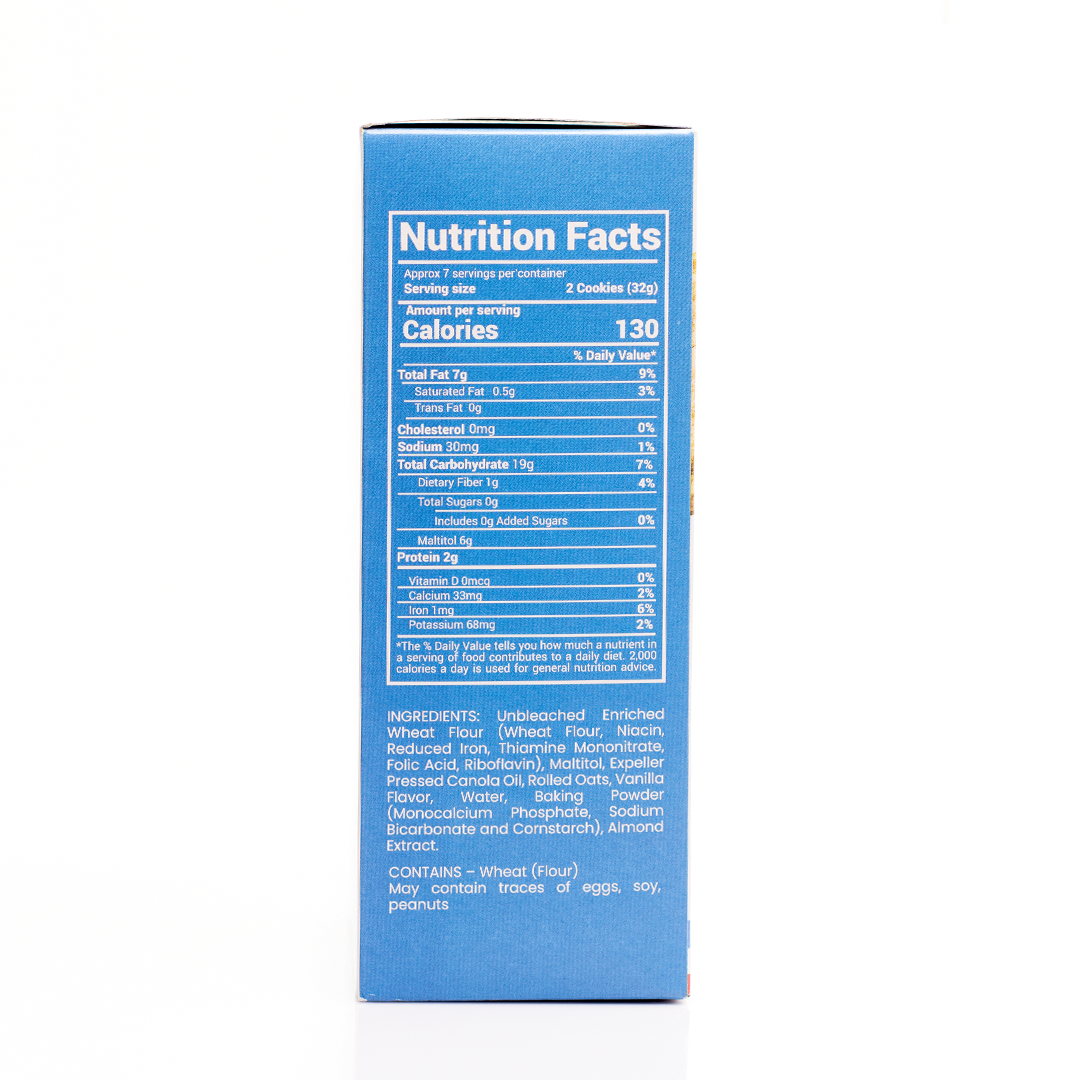 Rolled oats, unbleached wheat flour, Maltitol, non-GMO expeller-pressed canola oil, natural almond flavor, baking powder