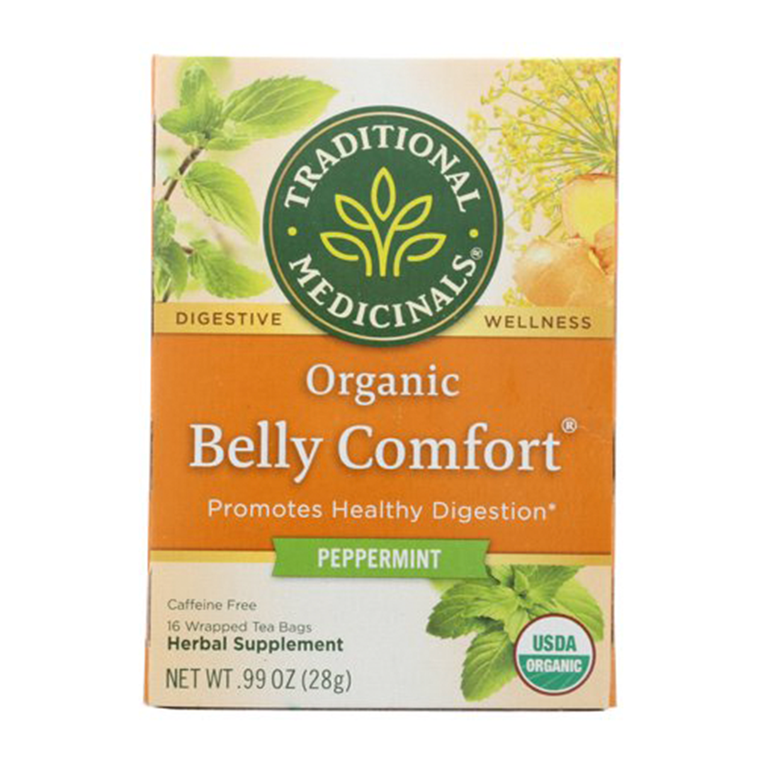 Traditional Medicinals Organic Belly Comfort tea is a combination of cool and refreshing peppermint, calming fennel, and spicy ginger to provide digestive support. Enjoy its minty flavor with milk, spiced notes after a meal to help soothe the belly or relieve indigestion.